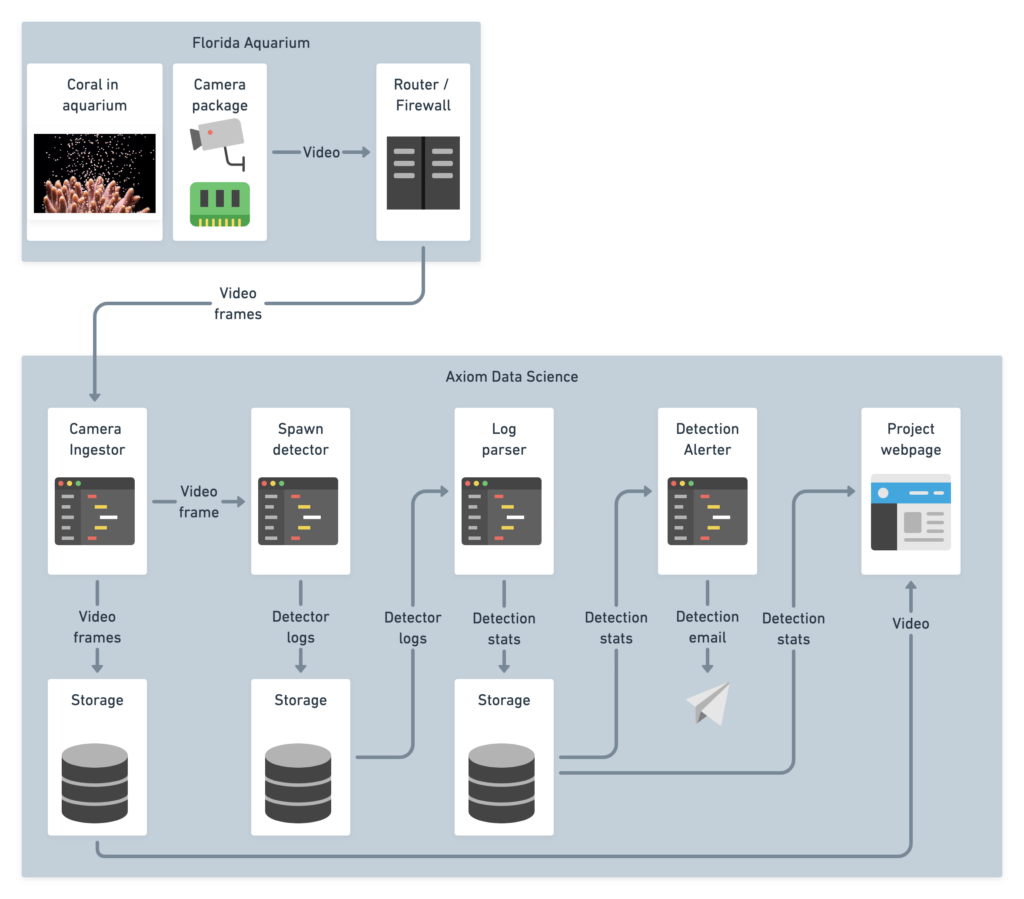 The implemented system is designed to ingest video data streams from networked cameras, apply a spawning detection model to the stream to identify when coral spawning, provide alerts to registered users if a spawning event is detected, and gather statistics about all spawning events.